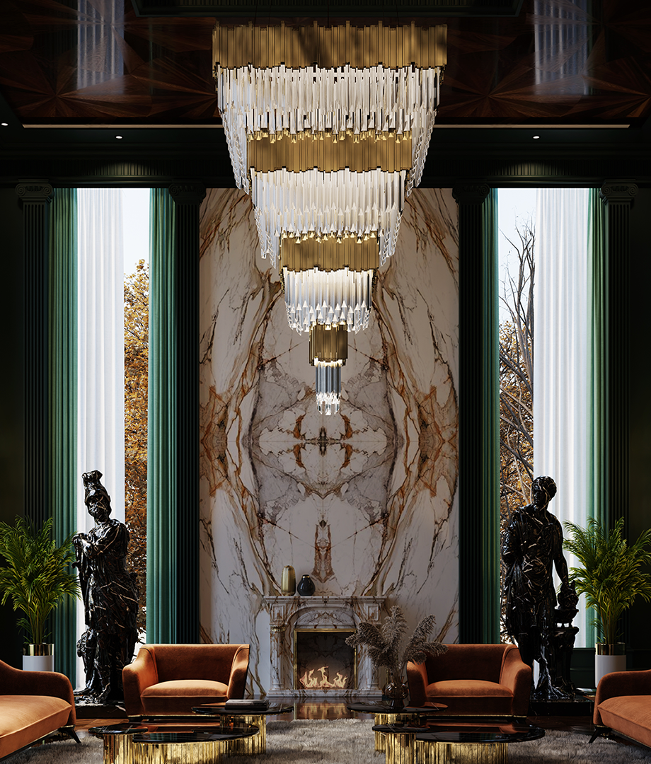Những mẫu đèn chùm lấy cảm hứng từ thiên nhiên, nghệ thuật châu Âu, hoặc phong cách hoàng gia luôn là lựa chọn lý tưởng cho không gian phòng khách sang trọng.