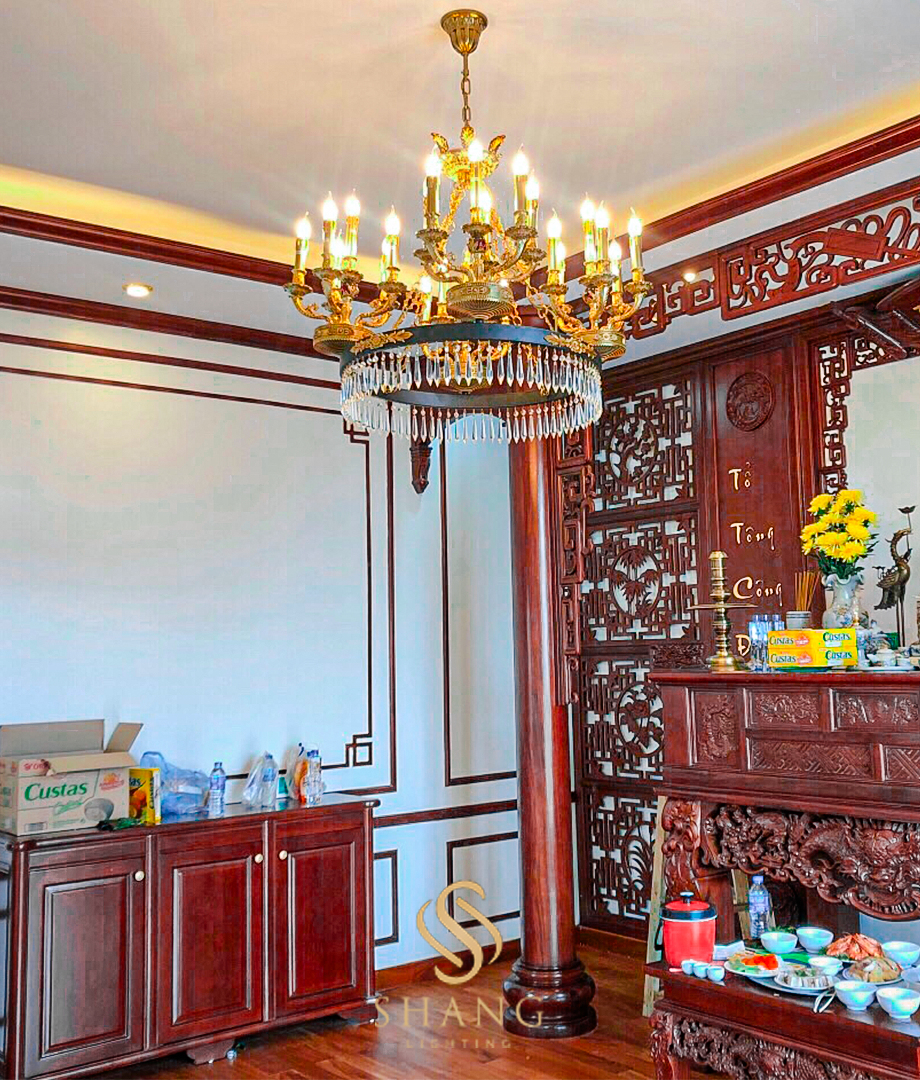 Đèn chùm đồng pha lê hòa hợp với phòng thờ