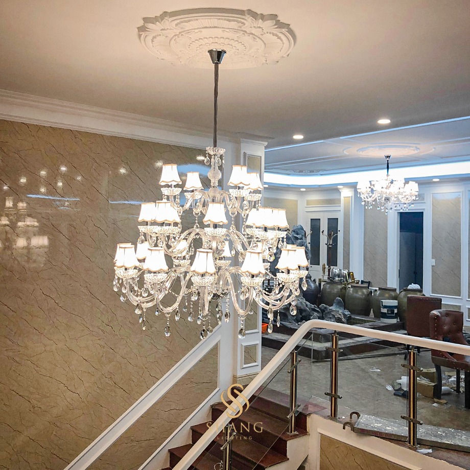 Từng mẫu đèn chùm trang trí trong dự án được chế tác thủ công bởi đội ngũ nghệ nhân giàu kinh nghiệm, tỉ mỉ trong từng chi tiết chạm khắc hoa văn và cắt pha lê. Chính sự tâm huyết ấy đã biến mỗi chiếc đèn trở thành một tuyệt phẩm nghệ thuật, góp phần khẳng định phong cách sống đẳng cấp của gia chủ.
